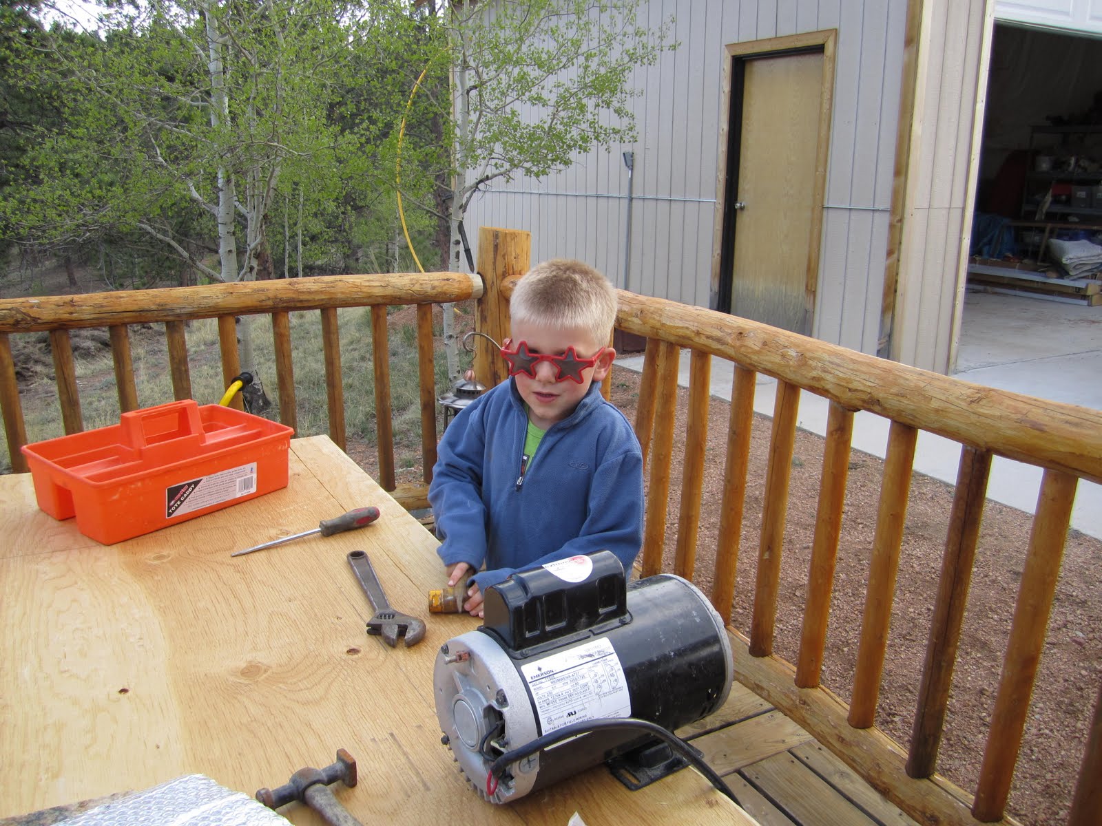 Evan was excited when Papa decided to work on the hot tub (the motor went out). He got his box of tools and did his best to help out!! He ran into the house once saying he needed to get his "safety" goggles as Papa told him they were needed - so that's just what he did!!