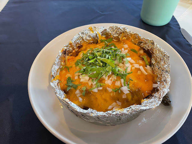 Thursday night we generally go over to the Spa Hotel (we can walk to it along the beach) and it's "grill" night - they have wonderful ribs and chicken but my favorite is the potato! This year they offer two kinds, one is a shredded beef and the other one is brisket and shrimp - I got the shredded beef and it was fantastic - it's huge and I only eat a portion and usually get 2 lunches out of the rest of it!
