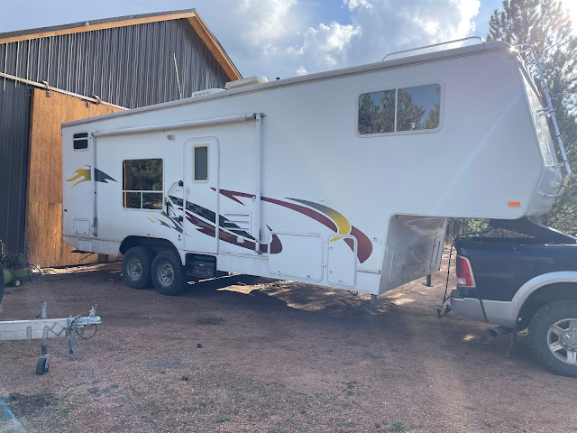 We bought a 5th wheel Toy Hauler!! After looking for a while and not finding anything, I happened to check Marketplace and there was one for sale - in Woodland Park even! We went in to look at it and decided it was perfect! It's a little longer than our old one but Glenn loves the fact he can just put the back down and drive the Razor in! So easy!! And an added perk was a built in generator!